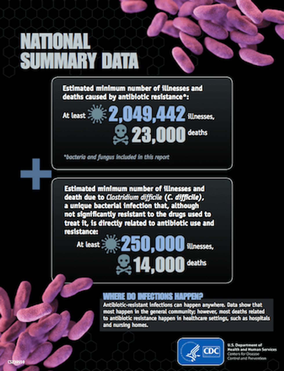 These infections, according to the CDC, occur most often outside of hospitals. Thus, the CDC report calls for responsible use of antibiotics and draws attention to the multiple reasons for the rise of superbugs that are leading to complicated and deadly infections. Those reasons include the use or misuse of antibiotics in human medicine and agriculture.